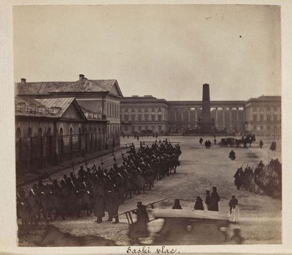 Russian troops marching toward Saski Palace in 1861. A section of the colonnade is the only part of the Palace that survives today as the Tomb of the Unknown Soldier.